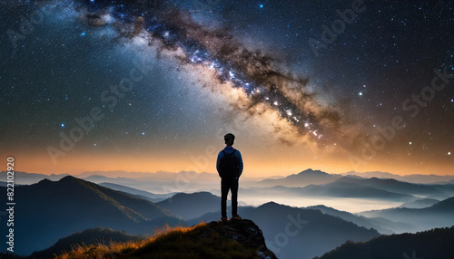 Silhouette of man on mountain peak under starry sky, reflecting contemplation and wonder of the universe