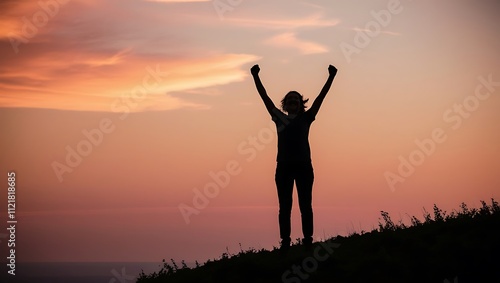 Silhouette of man open arms stay at sunset background