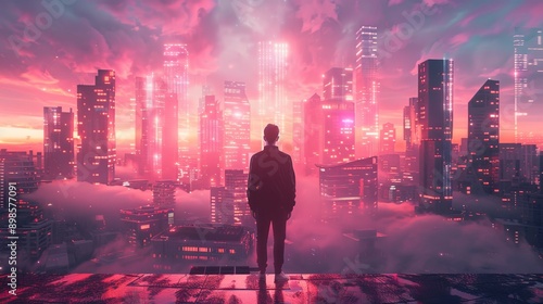 Silhouette of man overlooking futuristic cityscape with glowing skyscrapers at sunset