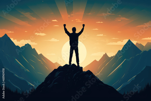 silhouette of man raising arms on top mountain. Victory and success background