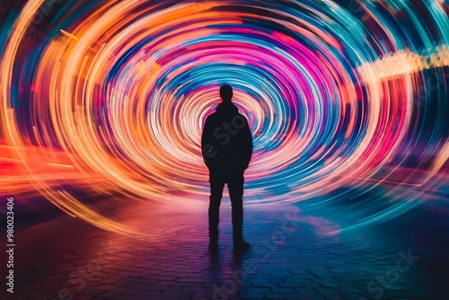 Silhouette of man standing in front of colorful swirling light trails, abstract photo