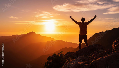 Silhouette of man with raised arms on mountain peak at sunset, celebrating success