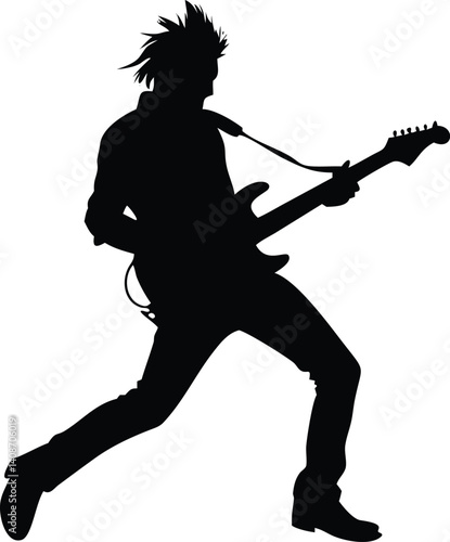 Silhouette of Man with Spiked Hair Playing Electric Guitar on Transparent Background