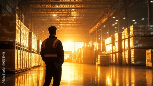 Silhouette of Manager in Industrial Warehouse at Sunset