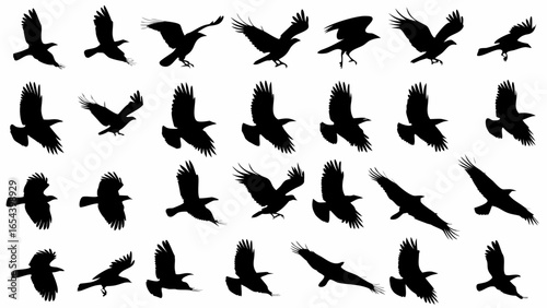 Silhouette of many crows in various flying positions against a white background in a repeating pattern