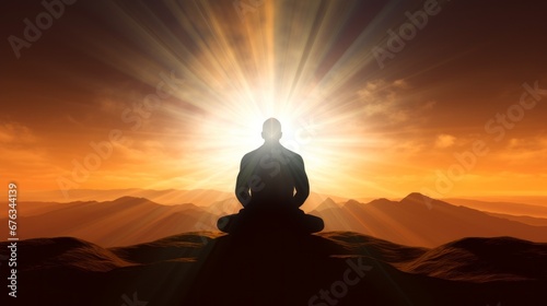 Silhouette of meditations on the background of the sun. A man meditates at sunset