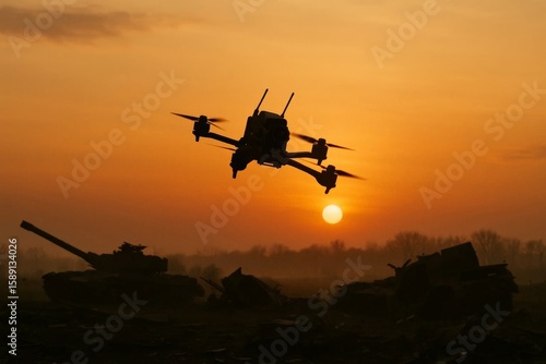 Silhouette of military drone flying over battlefield at sunset with destroyed tanks, symbolizing modern warfare, technology, and unmanned combat missions.