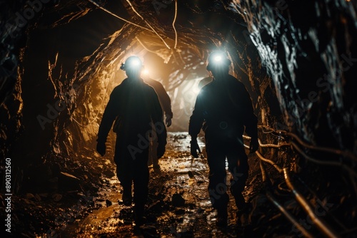 Silhouette of miners with headlamps entering underground coal mine, Industry worker