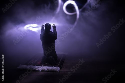 Silhouette of mosque building on toned foggy background. Ramadan Kareem background. Mosque at sunset. Praying people