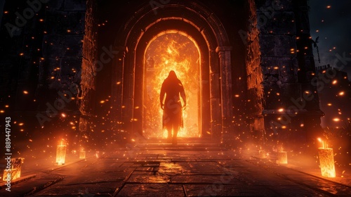 Silhouette of mysterious figure standing in fiery entrance, surrounded by glowing embers and ancient architecture.