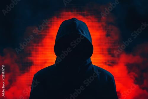 Silhouette of mysterious hooded figure against ominous red smoke backdrop, creating an intriguing atmosphere.