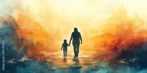 Silhouette of Parent and Child Walking in Watercolor