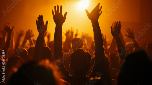 Silhouette of people raising their hands in celebration.