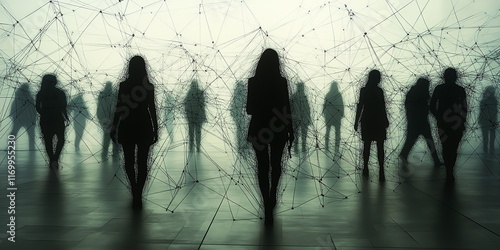 Silhouette of people standing in front of a web of lines, a representation of modern social connection.