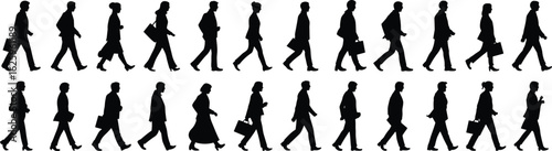 Silhouette of people walking in row, urban crowd motion vector, business professionals, man woman walking pose, isolated black figures
