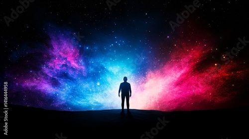 Silhouette of Person Against Cosmic Background - A solitary figure stands silhouetted against a vibrant, cosmic backdrop of swirling nebulae in shades of blue and pink