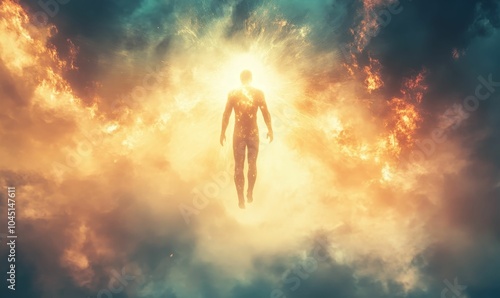 Silhouette of person ascending through glowing clouds.