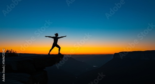 Silhouette of person balancing on cliff edge at sunset