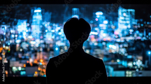 Silhouette of person gazing at futuristic cityscape on giant screen in dark auditorium symbolizing exploration, technology, and the unknown future as chaos unfolds in a digital world