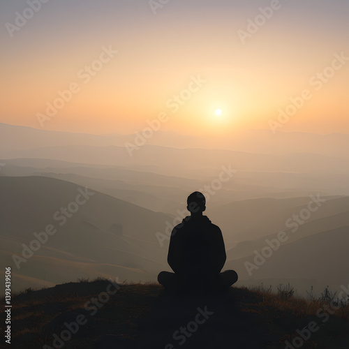Silhouette of Person Meditating on Mountain at Sunrise - Peaceful Mindfulness and Tranquility in Nature with Misty Hills and Golden Light