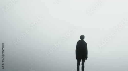 Silhouette of person standing in fog. Eerie photo of a single person facing away and surrounded by thick fog, conveying mystery and the unknown.