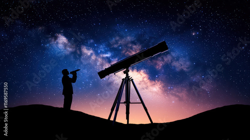 silhouette of person using telescope under stars