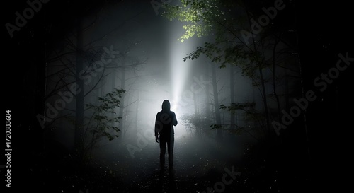 Silhouette of person with flashlight walking in dark foggy forest at night