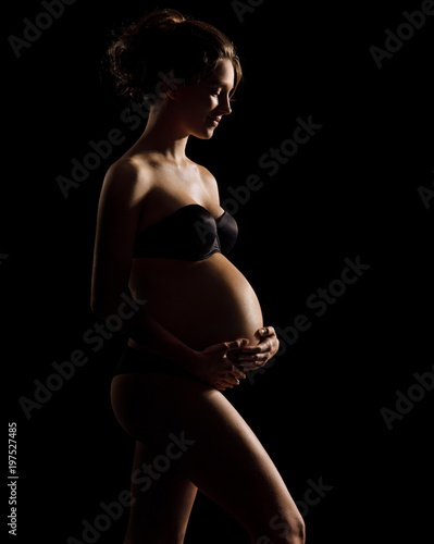 Silhouette of pregnant woman holds hands on belly on black background. Pregnancy, maternity, preparation and expectation concept