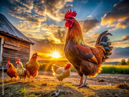 Silhouette of Rooster and Hens in Farmyard at Sunset