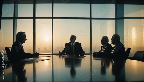 silhouette of senior executives meeting at the table in front of the window.