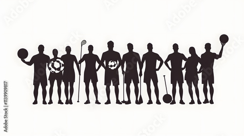 Silhouette of six sports team members standing together in unity, showcasing teamwork, strength, and solidarity in sports, emphasizing the power of collaboration and collective effort in athletic achi
