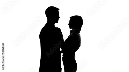 Silhouette of slim secretary tightly clinging to chest of her boss, romance