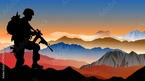 Silhouette of soldier with rifle at sunset over mountainous terrain