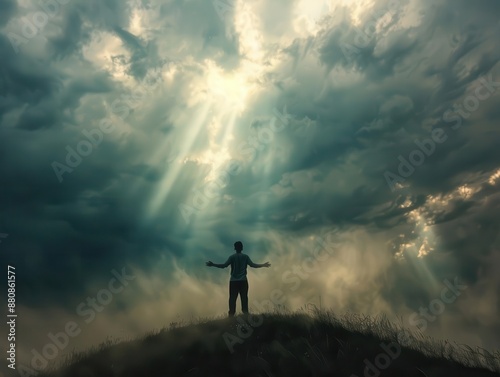 silhouette of solitary figure on hilltop arms outstretched beneath dramatic cloudy sky with ethereal light beams evoking spiritual awakening