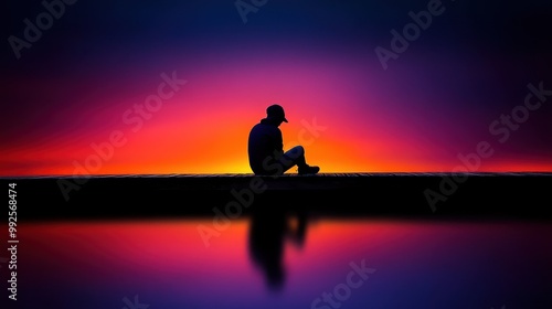 Silhouette of Solitude: A solitary figure sits in contemplation, silhouetted against a vibrant sunset over a serene body of water. The image evokes feelings of introspection, peace.