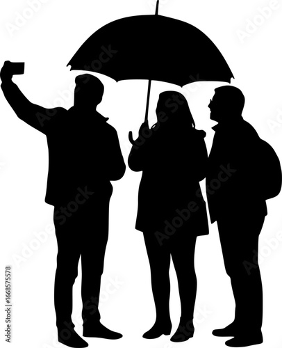 Silhouette of three people taking a selfie under an umbrella on a white background image design | editable eps vectors