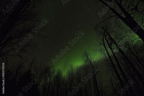 Silhouette of Trees against a Night Sky with Green Aurora Borealis