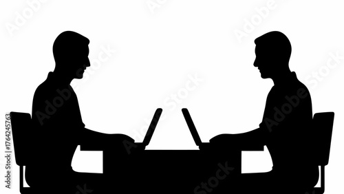 Silhouette of two people sitting at a table facing each other working on laptops in a black and white image
