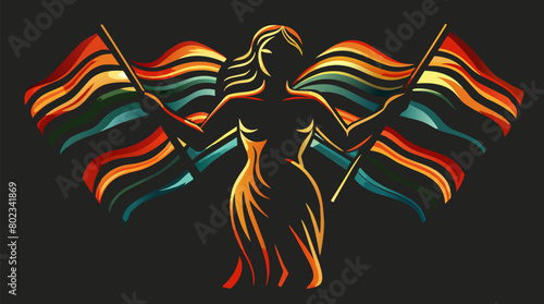 Silhouette of two women. Intimately posed. Holding a stylized rainbow pride flag. Representing lgbt solidarity. Diversity. Love. And pride in a striking. Artistic