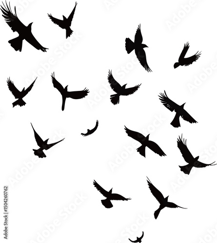 Silhouette of various birds in flight against a white background.