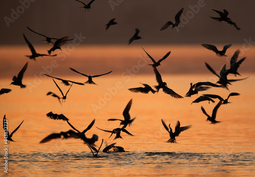 Silhouette of White-cheeked Terns fishing at Tubli bay, Bahrain