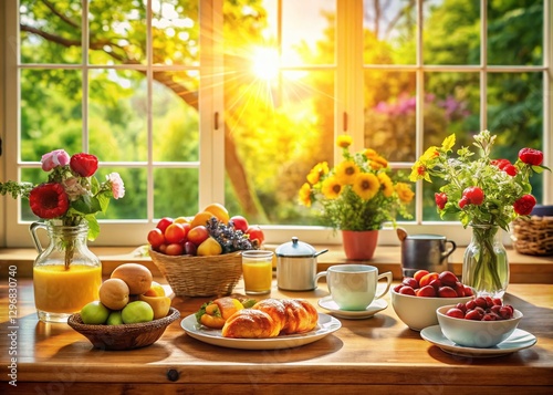 Silhouette of Window Frame with Delicious Food, Sunlit Kitchen, Breakfast Table