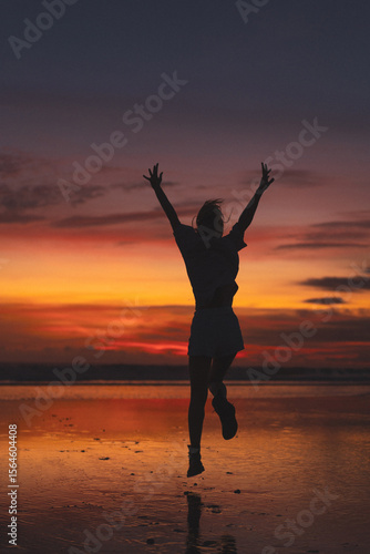 Silhouette of woman dancing joyfully on tropical beach at sunset