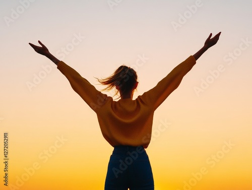 Silhouette of woman raising arms in golden sunset sky symbolizing freedom joy empowerment and mindfulness in inspirational atmospheric lifestyle photography