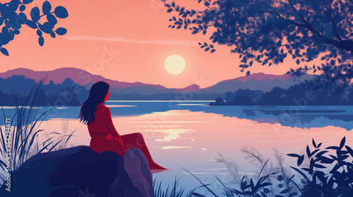 Silhouette of woman sitting on a rock by a lake at sunset, contemplating life, peaceful nature scenery, calm, meditation, reflection