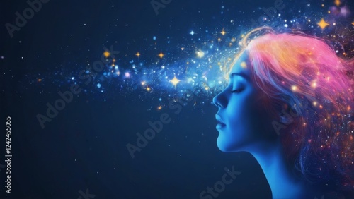 Silhouette of woman with closed eyes facing right against starry night sky in vibrant rainbow colors on dark blue.