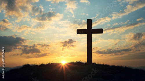 Silhouette of Wooden Cross Against Vibrant Sunrise in Peaceful Landscape : Generative AI