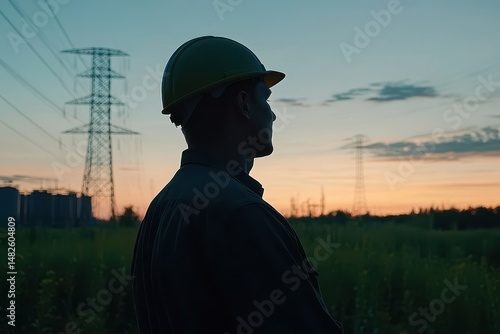 Silhouette of Worker Watching Sunset Near Power Lines in Evening Sky