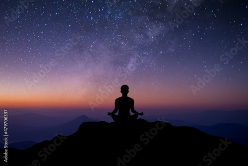 Silhouette of young female sitting practices yoga and meditating in lotus position alone on top of the mountain with night sky, star, Milky Way and meteor. She felt calm and happy.