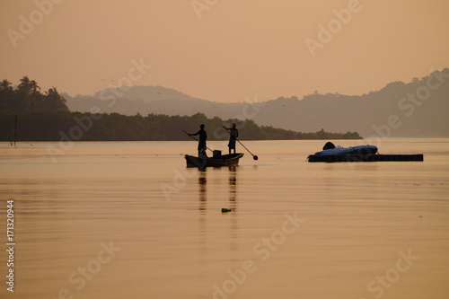 Silhouette of young indian boys on the boat. Sunset time. A little haze on the river
